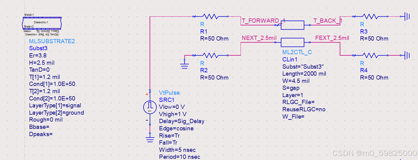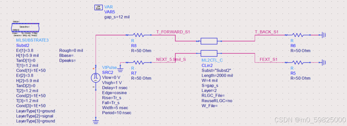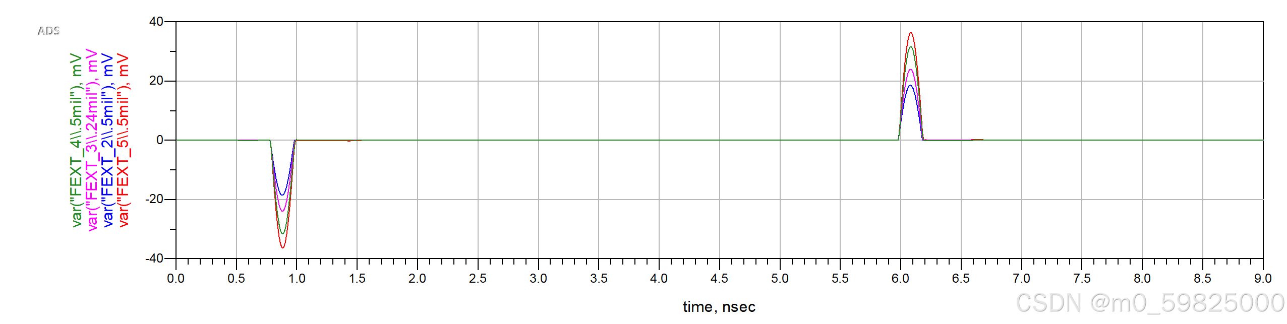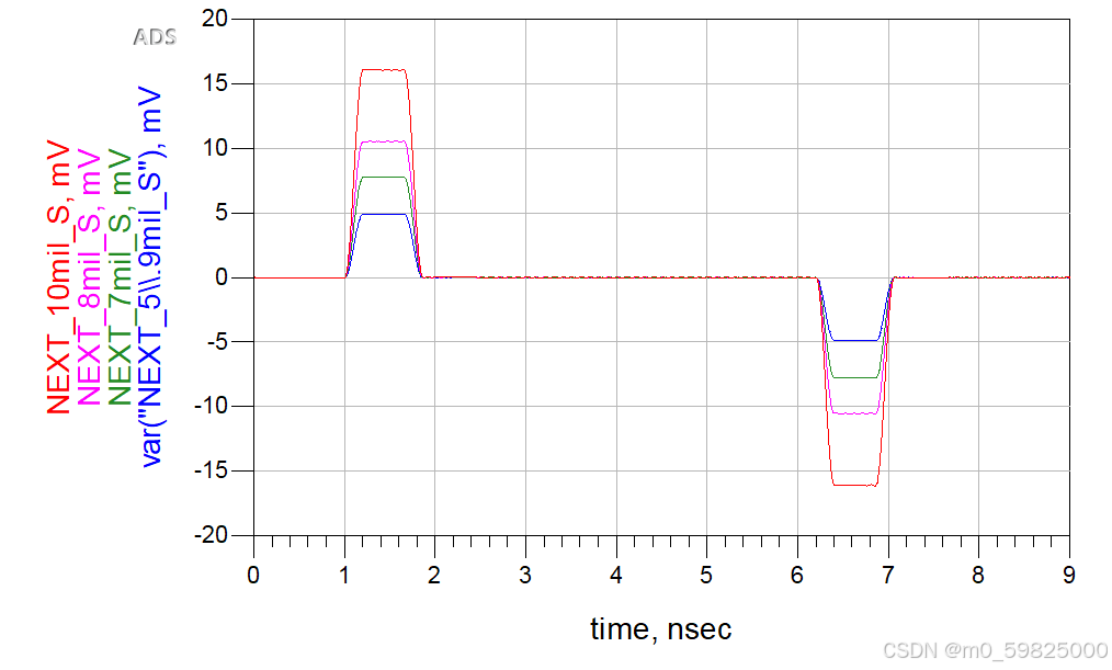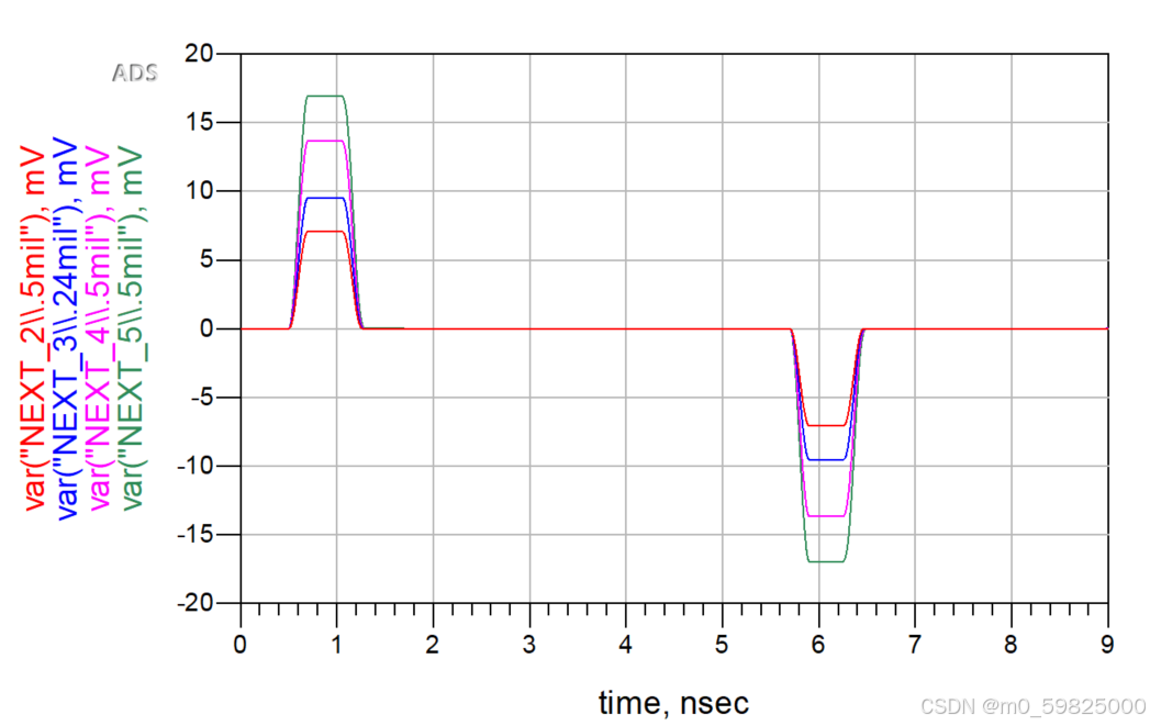若将走线调整到内层,仿真50Ω传输线 12mil线间距 5.9mil、7mil、8mil、10mil不同介质厚度对内层近端串扰的影响: