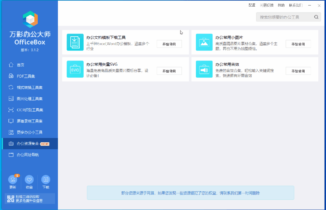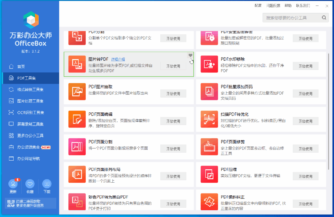 里面包含了PDF工具集、格式转换工具集、图片处理工具集、OCR识别工具集、屏幕录制工具集、办公小工具、办公资源和办公导航,八大类的免费办公工具集。