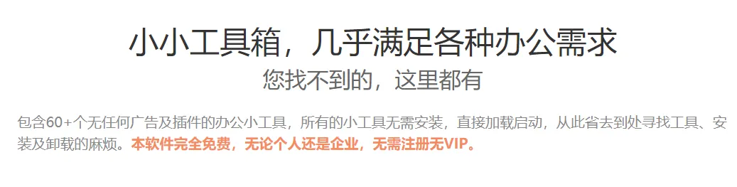 这是一款便捷高效的办公工具箱,体积小巧功能强悍,内置60+实用功能,无论个人还是企业都不需要注册更没有VIP机制,主打的就是个完全免费,绝对是电脑必装软件之一!