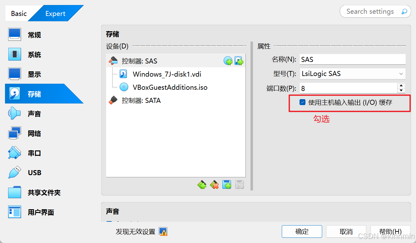 点击存储 (Storage)–> 控制器 (Controller):IDE 或 SATA, 勾选使用主机输入输出 (I/O) 缓存 (Use Host I/O Cache)。