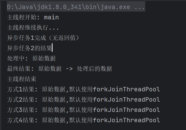 public class JavaAsyncDemo {// 定义线程池(推荐复用,避免频繁创建)private static final ExecutorService executor = new ThreadPoolExecutor(4, // 核心线程数8, // 最大线程数60, // 空闲线程存活时间TimeUnit.SECONDS,new LinkedBlockingQueue<>(100), // 任务队列new ThreadPoolExecutor.CallerRunsPolicy() // 拒绝策略);public static void main(String[] args) throws Exception {System.out.println("主线程开始: " + Thread.currentThread().getName());// 方式1: 基础异步执行(无返回值)executor.execute(() -> {try {Thread.sleep(1000);System.out.println("异步任务1完成(无返回值)");} catch (InterruptedException e) {Thread.currentThread().interrupt();}});// 方式2: 带返回值的异步执行(Future)Future<String> future = executor.submit(() -> {Thread.sleep(1500);return "异步任务2的结果";});// 方式3: 高级异步编程(CompletableFuture)CompletableFuture<Void> cf = CompletableFuture.supplyAsync(() -> {try {Thread.sleep(2000);return "原始数据";} catch (InterruptedException e) {throw new RuntimeException(e);}}, executor)// 异步处理结果(链式调用).thenApplyAsync(data -> {System.out.println("处理中: " + data);return data + " -> 处理后的数据";}, executor)// 异步消费结果.thenAcceptAsync(result -> {System.out.println("最终结果: " + result);}, executor);// 主线程继续执行其他操作(非阻塞)System.out.println("主线程继续执行...");Thread.sleep(500);// 获取方式2的结果(会阻塞直到结果返回)System.out.println(future.get());// 等待方式3完成cf.get();// 关闭线程池executor.shutdown();executor.awaitTermination(1, TimeUnit.MINUTES);System.out.println("主线程结束");//默认使用forkJoinThreadPoolCompletableFuture<String> futureTask = CompletableFuture.supplyAsync(() -> {try {Thread.sleep(2000);return "原始数据,默认使用forkJoinThreadPool";} catch (InterruptedException e) {throw new RuntimeException(e);}});// 方式1: get() - 阻塞等待结果(无超时)try {String result1 = futureTask.get();System.out.println("方式1结果: " + result1);} catch (InterruptedException | ExecutionException e) {e.printStackTrace();}// 方式2: get(long timeout, TimeUnit unit) - 带超时的阻塞等待try {// 超时设置为3秒String result2 = futureTask.get(3, TimeUnit.SECONDS);System.out.println("方式2结果: " + result2);} catch (InterruptedException | ExecutionException | TimeoutException e) {e.printStackTrace();}// 方式3: join() - 阻塞等待(无超时,只抛出未检查异常)try {String result3 = futureTask.join();System.out.println("方式3结果: " + result3);} catch (RuntimeException e) { // supplyAsync中抛出的RuntimeException会被捕获e.printStackTrace();}// 方式4: 非阻塞回调处理(推荐)futureTask.whenComplete((result, ex) -> {if (ex == null) {System.out.println("方式4结果: " + result);} else {System.out.println("方式4出错: " + ex.getMessage());}});// 等待回调执行完成(实际业务中无需此步骤,这里仅为演示)try {Thread.sleep(3000);} catch (InterruptedException e) {e.printStackTrace();}}