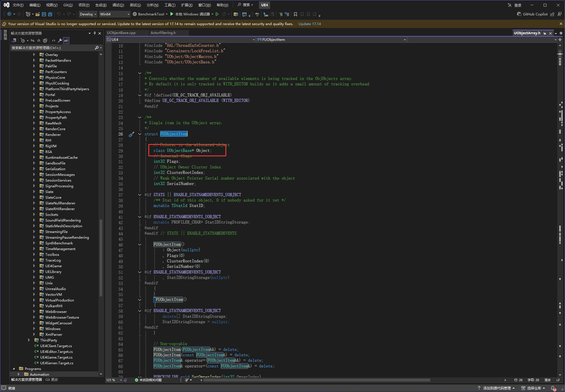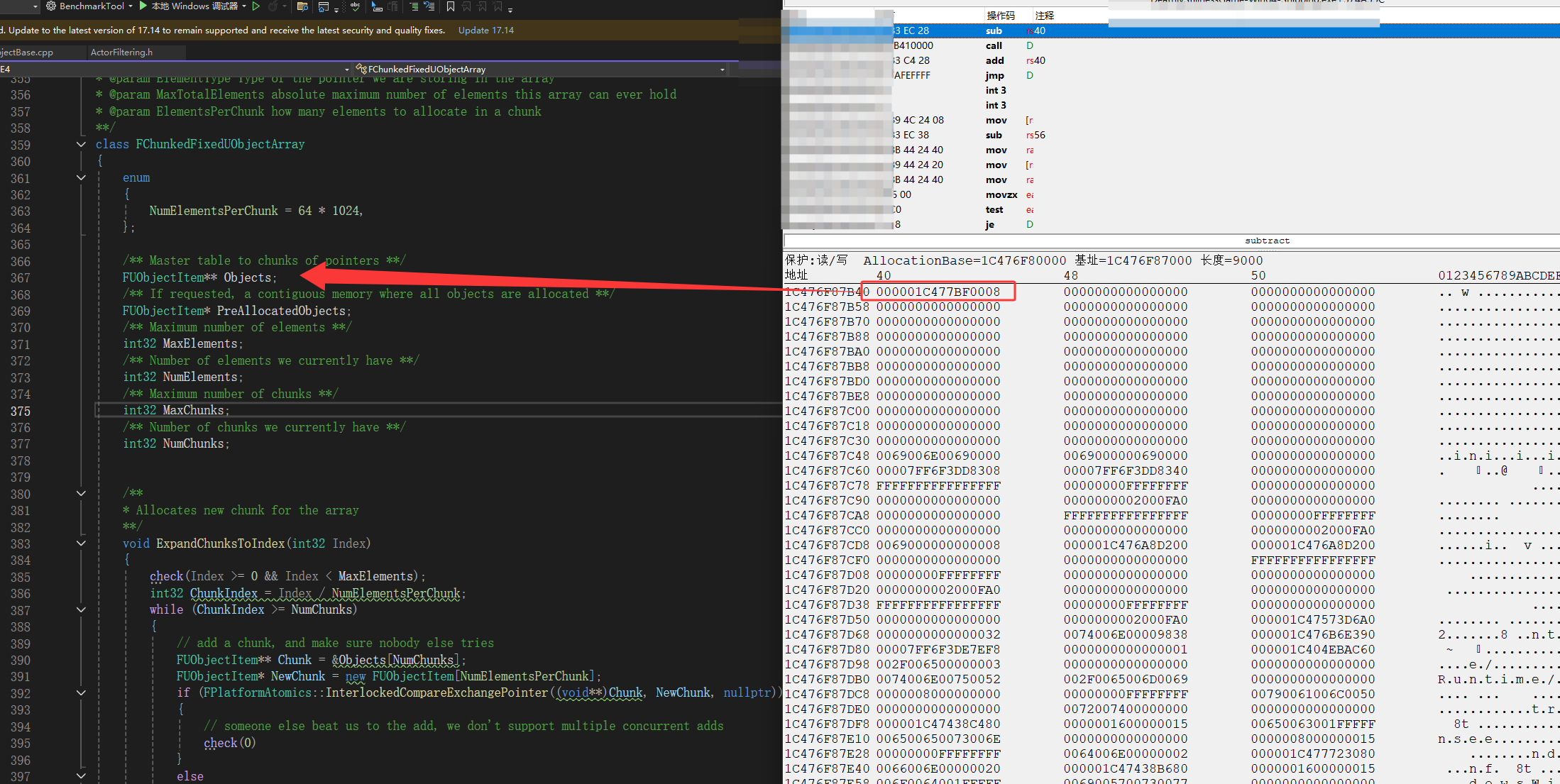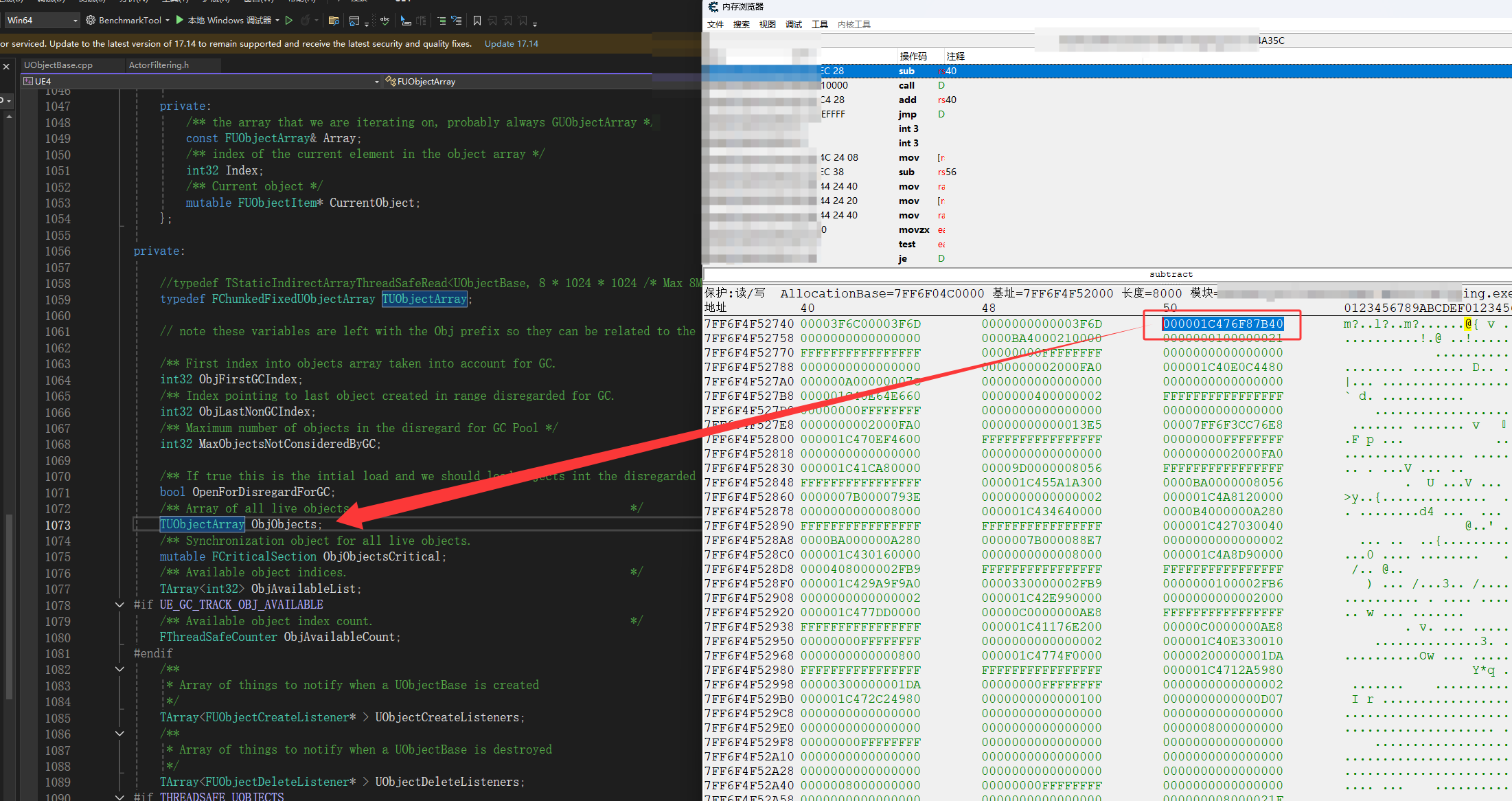 然后进入TUObjectArray里的FUObjectItem**,也就是单击下图红框,然后按空格