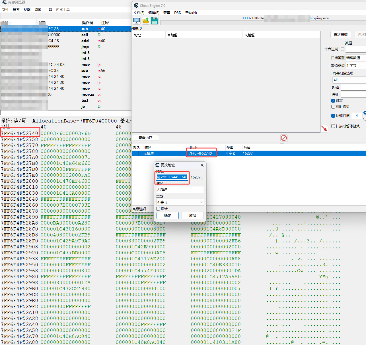 这里有个东西,FName它有里面有一个字符串的索引(id),这里可以使用CE找到UObjectBase类型的值,然后查看NamePrivate的值,然后使用之前实现的GName算法来看看它的FName是什么,首先使用0x4A92740偏移来到FUObjectArray