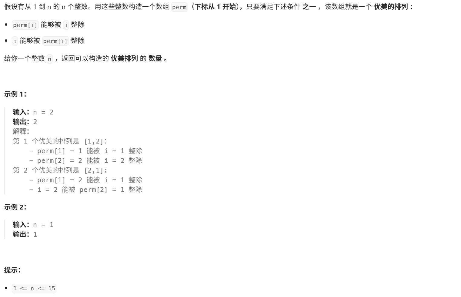 public:int countArrangement(int n) {dfs(1,n);return ret;}void dfs(int start,int n){//递归出口if(start==n+1){ret++;return ;}for(int i=1;i<=n;i++){if(used[i]==false&&((i%start==0)||(start%i==0))){used[i]=true;dfs(start+1,n);//回溯恢复现场used[i]=false;}}}};