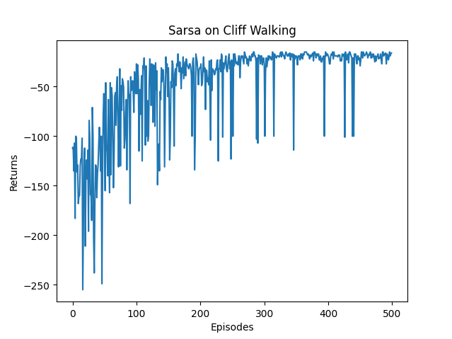 if __name__ == '__main__':ncol = 12nrow = 4env = CliffWalkingEnv(ncol, nrow) # 创建悬崖环境np.random.seed(0)epsilon = 0.1 # 0.1/0.9/0.01alpha = 0.1 # 0.1/0.05/0.3gamma = 0.9 # 0.9/0.98/0.8agent = Sarsa(ncol, nrow, epsilon, alpha, gamma) # 创建Sarsa算法对象num_episodes = 500 # 智能体在环境中运行的序列的数量return_list = [] # 记录每一条序列的回报for i in range(10): # 显示10个进度条# tqdm的进度条功能with tqdm(total=int(num_episodes / 10), desc='Iteration %d' % i) as pbar:for i_episode in range(int(num_episodes / 10)): # 每个进度条的序列数episode_return = 0state = env.reset()action = agent.take_action(state) # 智能体根据当前状态选择一个动作done = Falsewhile not done:next_state, reward, done = env.step(action) # 环境交互:智能体在环境中执行动作并观察结果next_action = agent.take_action(next_state) # 策略执行:根据当前状态选择下一个动作episode_return += reward # 这里回报的计算不进行折扣因子衰减agent.update(state, action, reward, next_state, next_action) # 更新智能体的策略参数state = next_stateaction = next_actionreturn_list.append(episode_return)if (i_episode + 1) % 10 == 0: # 每10条序列打印一下这10条序列的平均回报pbar.set_postfix({'episode':'%d' % (num_episodes / 10 * i + i_episode + 1),'return':'%.3f' % np.mean(return_list[-10:])})pbar.update(1)episodes_list = list(range(len(return_list)))plt.plot(episodes_list, return_list)plt.xlabel('Episodes')plt.ylabel('Returns')plt.title('Sarsa on {}'.format('Cliff Walking'))plt.show()action_meaning = ['^', 'v', '<', '>']print(f"epsilon:{epsilon}\talpha:{alpha}\tgamma:{gamma}")print('Sarsa算法最终收敛得到的策略为:')print_agent(agent, env, action_meaning, list(range(37, 47)), [47])