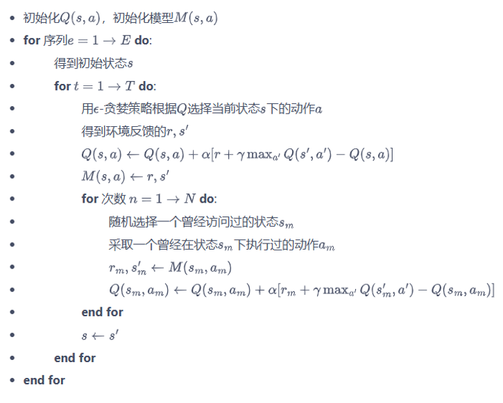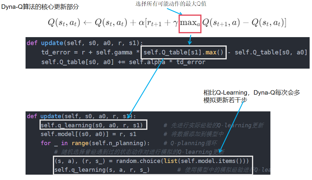 - update:先进行实际经验的Q-learning更新,再通过环境模型生成模拟经验,多次迭代更新Q值,提升学习效率。