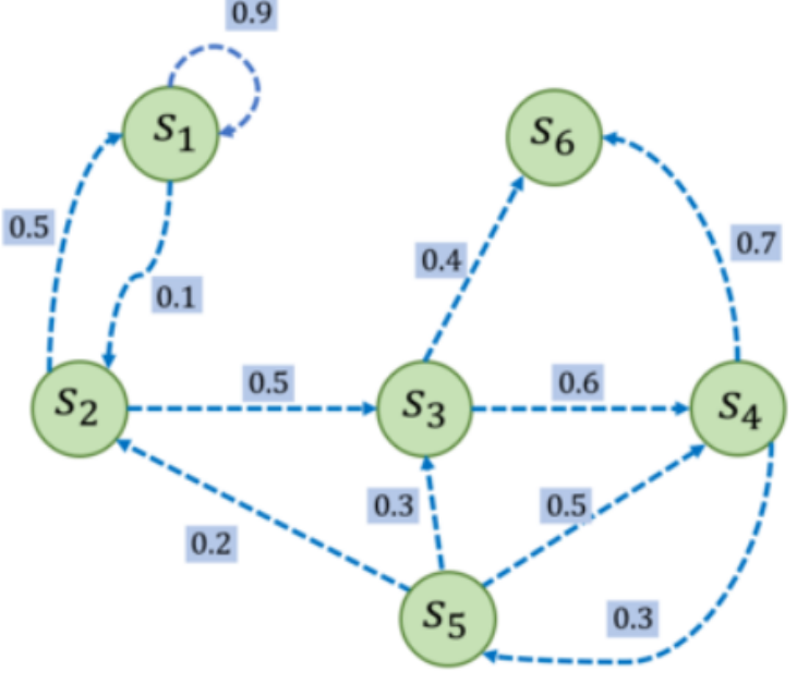 P = [[0.9, 0.1, 0.0, 0.0, 0.0, 0.0],[0.5, 0.0, 0.5, 0.0, 0.0, 0.0],[0.0, 0.0, 0.0, 0.6, 0.0, 0.4],[0.0, 0.0, 0.0, 0.0, 0.3, 0.7],[0.0, 0.2, 0.3, 0.5, 0.0, 0.0],[0.0, 0.0, 0.0, 0.0, 0.0, 1.0],