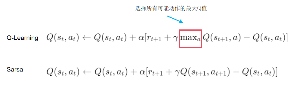 - Q-Learning更新规则:选择所有可能动作的最大Q值来更新,该动作不一定是策略选择的动作。