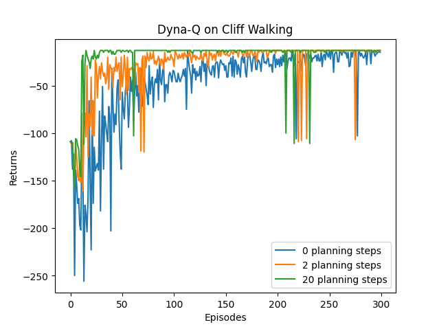 def DynaQ_CliffWalking(n_planning):ncol = 12nrow = 4env = CliffWalkingEnv(ncol, nrow)epsilon = 0.01alpha = 0.1gamma = 0.9agent = DynaQ(ncol, nrow, epsilon, alpha, gamma, n_planning)num_episodes = 300 # 智能体在环境中运行多少条序列return_list = [] # 记录每一条序列的回报for i in range(10): # 显示10个进度条# tqdm的进度条功能with tqdm(total=int(num_episodes / 10),desc='Iteration %d' % i) as pbar:for i_episode in range(int(num_episodes / 10)): # 每个进度条的序列数episode_return = 0state = env.reset()done = Falsewhile not done:action = agent.take_action(state)next_state, reward, done = env.step(action)episode_return += reward # 这里回报的计算不进行折扣因子衰减agent.update(state, action, reward, next_state)state = next_statereturn_list.append(episode_return)if (i_episode + 1) % 10 == 0: # 每10条序列打印一下这10条序列的平均回报pbar.set_postfix({'episode':'%d' % (num_episodes / 10 * i + i_episode + 1),'return':'%.3f' % np.mean(return_list[-10:])})pbar.update(1)return return_listif __name__ == '__main__':np.random.seed(0)random.seed(0)n_planning_list = [0, 2, 20]for n_planning in n_planning_list:print('Q-planning步数为:%d' % n_planning)time.sleep(0.5)return_list = DynaQ_CliffWalking(n_planning)episodes_list = list(range(len(return_list)))plt.plot(episodes_list,return_list,label=str(n_planning) + ' planning steps')plt.legend()plt.xlabel('Episodes')plt.ylabel('Returns')plt.title('Dyna-Q on {}'.format('Cliff Walking'))plt.show()