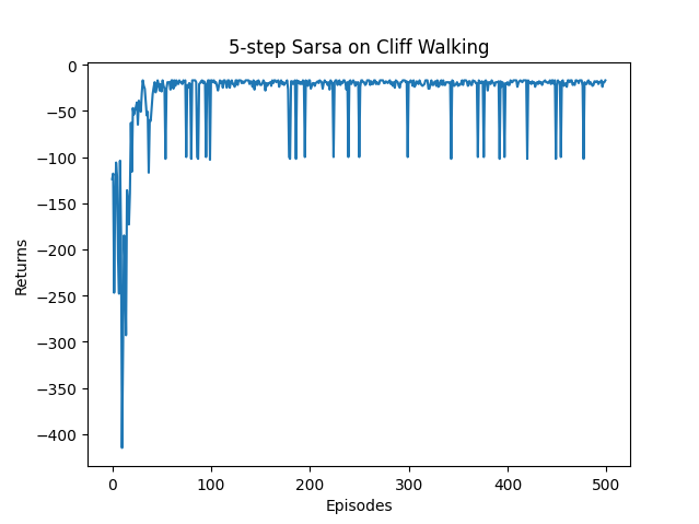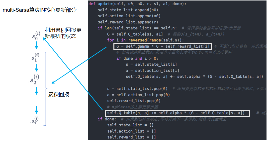 class nstep_Sarsa:""" n步Sarsa算法 """def __init__(self, n, ncol, nrow, epsilon, alpha, gamma, n_action=4):self.Q_table = np.zeros([nrow * ncol, n_action])self.n_action = n_actionself.alpha = alphaself.gamma = gammaself.epsilon = epsilonself.n = n # 采用n步Sarsa算法self.state_list = [] # 保存之前的状态self.action_list = [] # 保存之前的动作self.reward_list = [] # 保存之前的奖励def take_action(self, state):if np.random.random() < self.epsilon:action = np.random.randint(self.n_action)else:action = np.argmax(self.Q_table[state])return actiondef best_action(self, state): # 用于打印策略Q_max = np.max(self.Q_table[state])a = [0 for _ in range(self.n_action)]for i in range(self.n_action):if self.Q_table[state, i] == Q_max:a[i] = 1return adef update(self, s0, a0, r, s1, a1, done):self.state_list.append(s0)self.action_list.append(a0)self.reward_list.append(r)if len(self.state_list) == self.n: # 若保存的数据可以进行n步更新G = self.Q_table[s1, a1] # 得到Q(s_{t+n}, a_{t+n})for i in reversed(range(self.n)):G = self.gamma * G + self.reward_list[i] # 不断向前计算每一步的回报# 如果到达终止状态,最后几步虽然长度不够n步,也将其进行更新if done and i > 0:s = self.state_list[i]a = self.action_list[i]self.Q_table[s, a] += self.alpha * (G - self.Q_table[s, a])s = self.state_list.pop(0) # 将需要更新的最初的状态动作从列表中删除,下次不必更新a = self.action_list.pop(0)self.reward_list.pop(0)# n步Sarsa的主要更新步骤self.Q_table[s, a] += self.alpha * (G - self.Q_table[s, a]) # 根据n步后的值,更新最初的状态动作对Qif done: # 如果到达终止状态,即将开始下一条序列,则将列表全清空self.state_list = []self.action_list = []self.reward_list = []