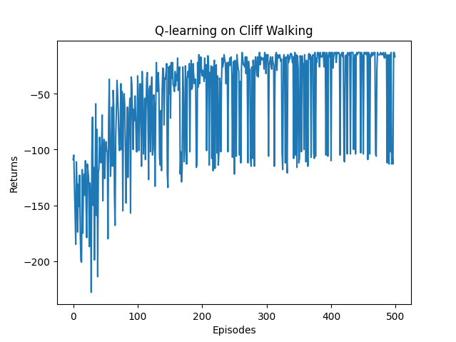 if __name__ == '__main__':ncol = 12nrow = 4env = CliffWalkingEnv(ncol, nrow)np.random.seed(0)epsilon = 0.1alpha = 0.1gamma = 0.9agent = QLearning(ncol, nrow, epsilon, alpha, gamma)num_episodes = 500 # 智能体在环境中运行的序列的数量return_list = [] # 记录每一条序列的回报for i in range(10): # 显示10个进度条# tqdm的进度条功能with tqdm(total=int(num_episodes / 10), desc='Iteration %d' % i) as pbar:for i_episode in range(int(num_episodes / 10)): # 每个进度条的序列数episode_return = 0state = env.reset()done = Falsewhile not done:action = agent.take_action(state)next_state, reward, done = env.step(action)episode_return += reward # 这里回报的计算不进行折扣因子衰减agent.update(state, action, reward, next_state)state = next_statereturn_list.append(episode_return)if (i_episode + 1) % 10 == 0: # 每10条序列打印一下这10条序列的平均回报pbar.set_postfix({'episode':'%d' % (num_episodes / 10 * i + i_episode + 1),'return':'%.3f' % np.mean(return_list[-10:])})pbar.update(1)episodes_list = list(range(len(return_list)))plt.plot(episodes_list, return_list)plt.xlabel('Episodes')plt.ylabel('Returns')plt.title('Q-learning on {}'.format('Cliff Walking'))plt.show()action_meaning = ['^', 'v', '<', '>']print('Q-learning算法最终收敛得到的策略为:')print_agent(agent, env, action_meaning, list(range(37, 47)), [47])