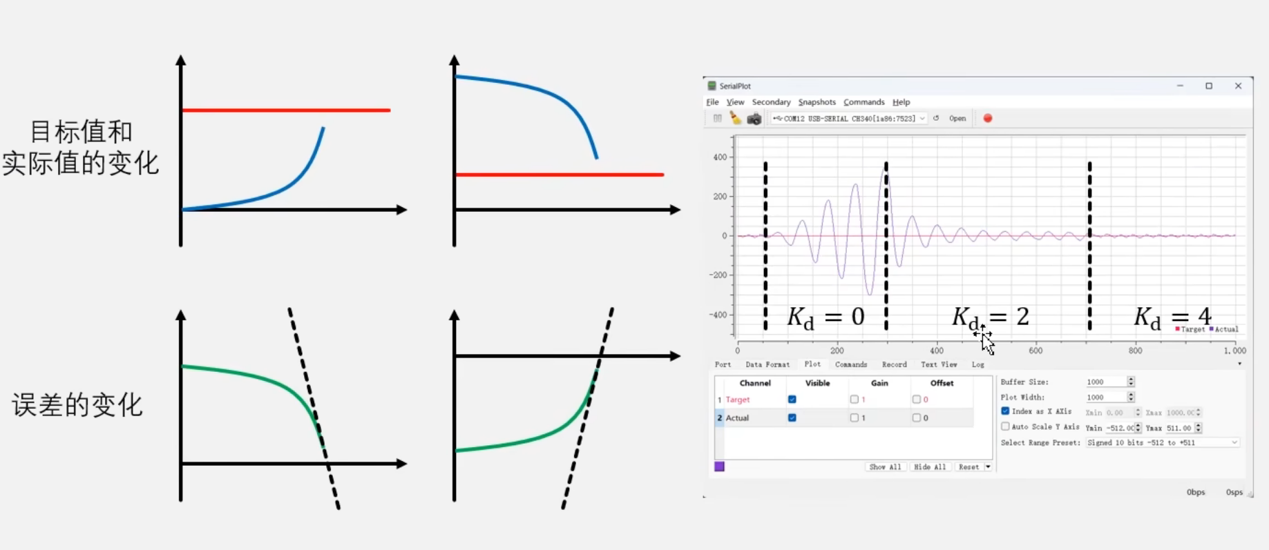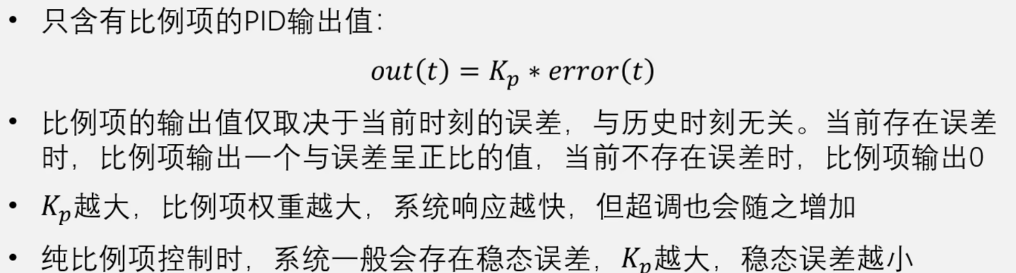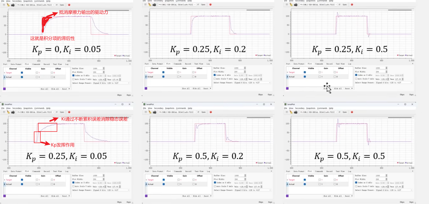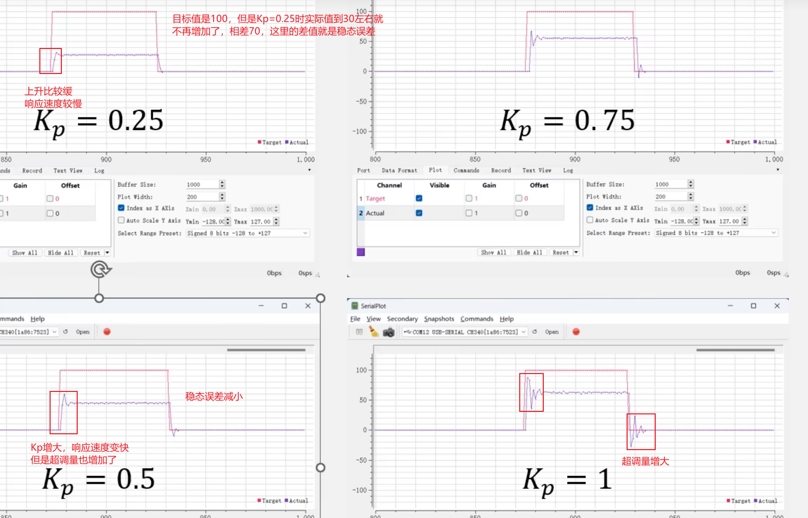 Kp表示调节力度,太小系统响应慢,太大系统超调严重,甚至自激振荡