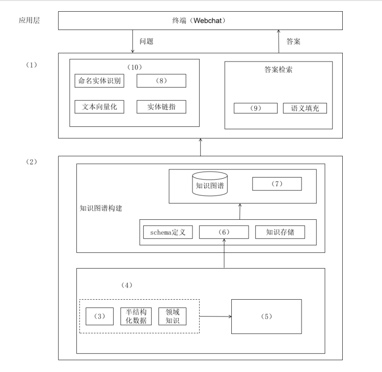 【问题1】(10分)图1展示了基于知识图谱的医药领域智能问答系统的架构设计方案,请从给出的(a)~(p)中选择,补充完善图1中(1)~(10)空处的内容。