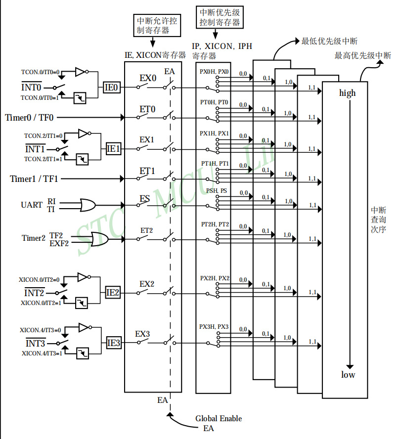下图为所有中断的控制位,外部中断有两种模式,检测外部下降沿或者低电平,由IT0或者IT1控制。IE0和IE1为中断标志位,一般清零。EX0和EX1为中断允许标志位,EA为总中断允许标志位,PX0和PX1为中断优先级。