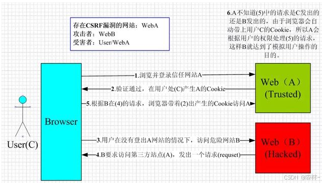 CSRF(Cross-site Request Forgery,跨站请求伪造)是一种攻击方式:攻击者利用用户的登录状态(Cookie 中的 SessionID),伪造用户请求访问受信任网站,执行恶意操作(如转账、删除数据)。