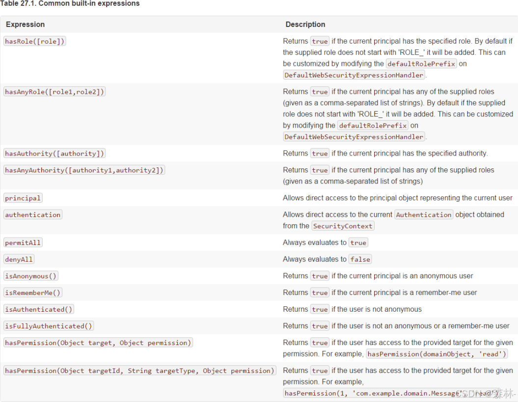 方法支持 Spring EL 表达式,可实现更灵活的权限判断,内置表达式与之前的方法对应: