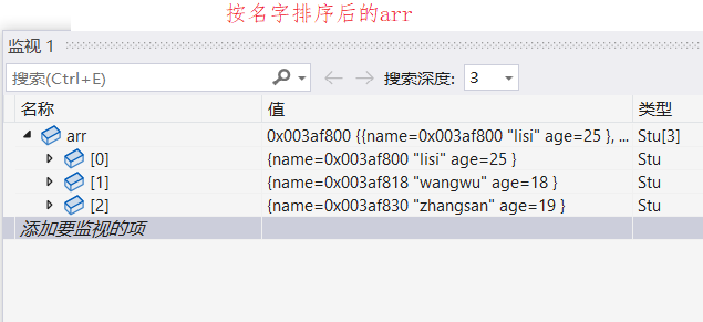 {//结构体数组struct Stu arr[3] = { {"zhangsan",19},{"lisi",25},{"wangwu",18}};//利用qsort对arr的name进行排序int sz = sizeof(arr) / sizeof(arr[0]);//qsort用比较函数的函数指针作为参数,在内部进行调用qsort(arr, sz, sizeof(arr[0]), cmp_by_name);return 0;