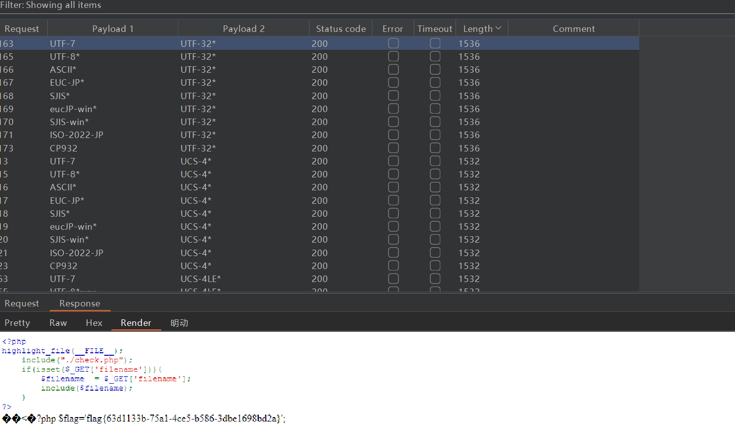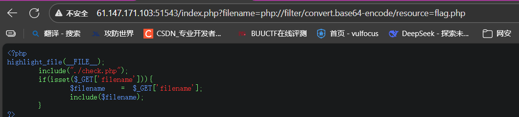 highlight_file(__FILE__);include("./check.php");if(isset($_GET['filename'])){$filename = $_GET['filename'];include($filename);}