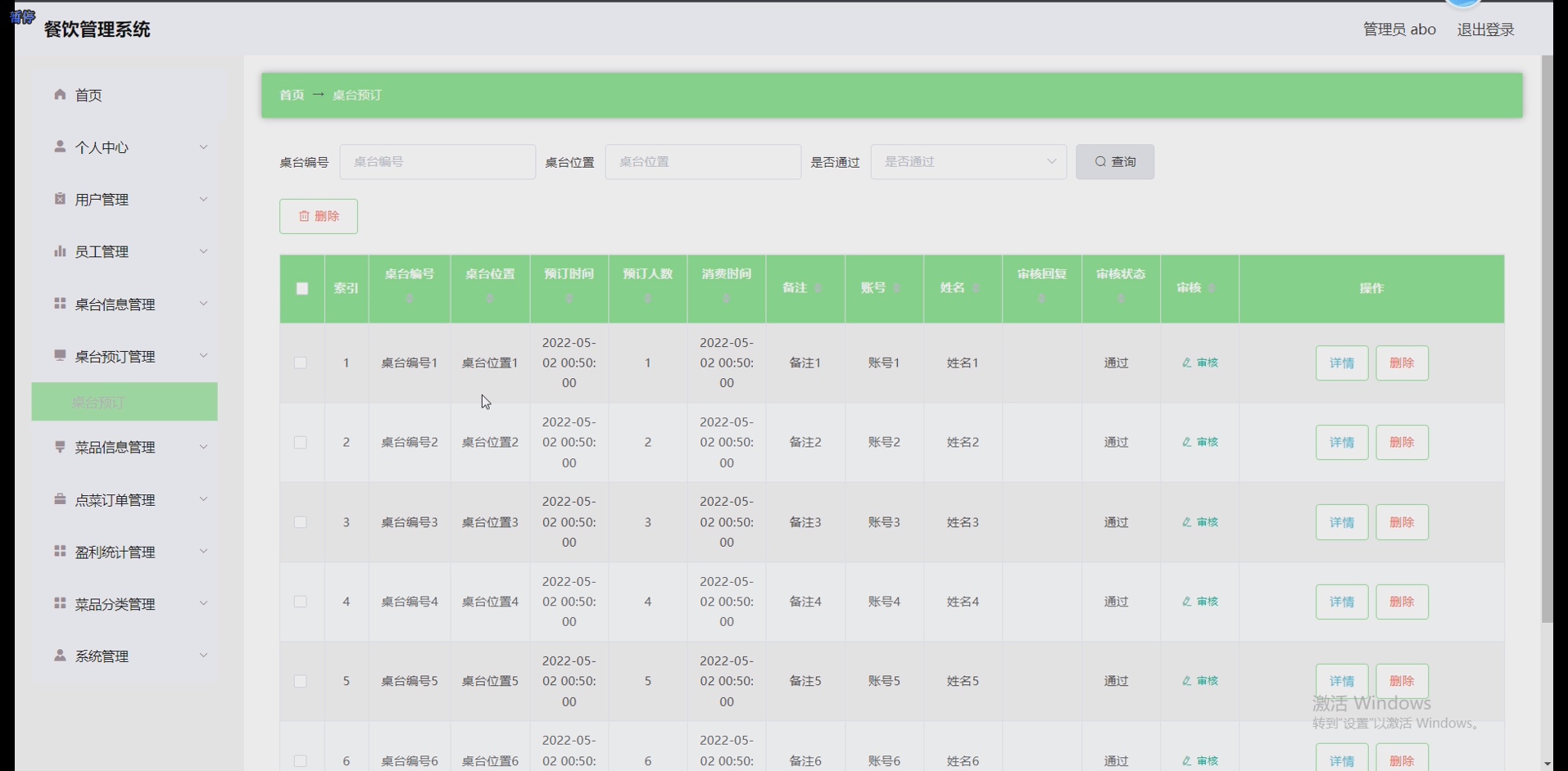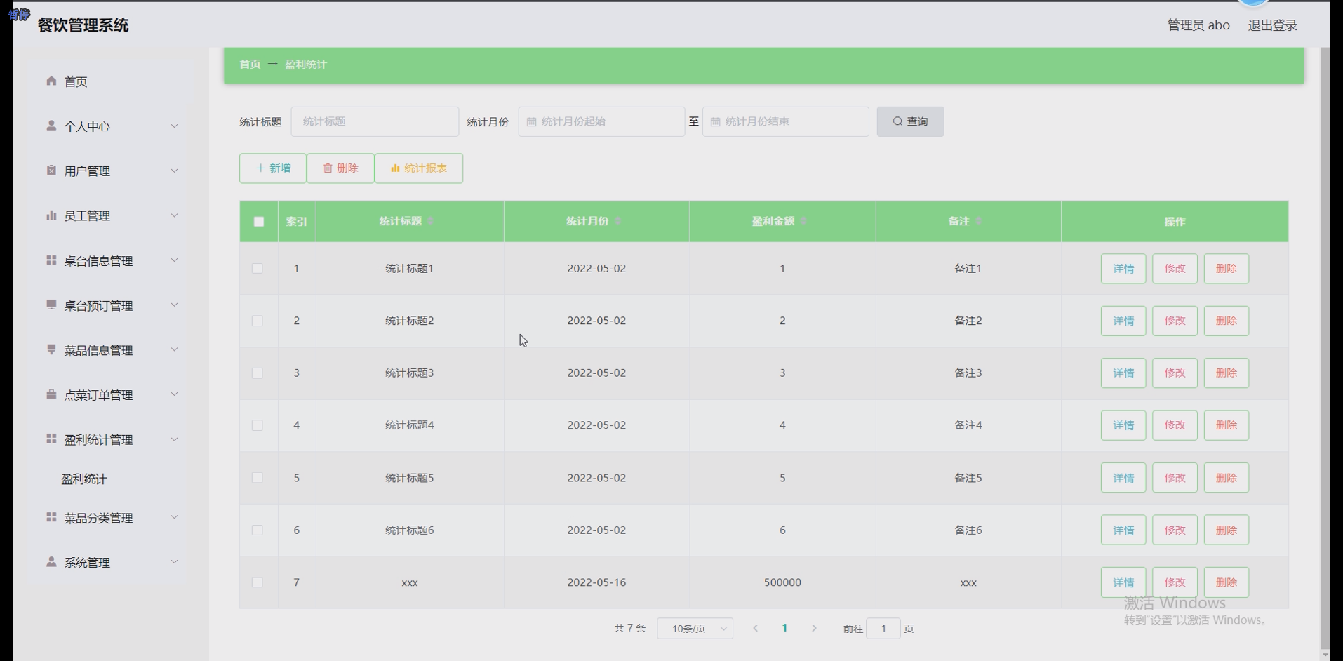 用户,员工,桌台信息,桌台预订,菜品信息,点菜订单,盈利统计,菜品分类