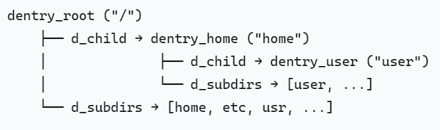 struct dentry {atomic_t d_count; // 引用计数struct inode *d_inode; // 关联的inodestruct hlist_node d_hash; // 哈希表链接 - 用于快速查找struct dentry *d_parent; // 父目录dentry - 构建树形结构struct qstr d_name; // 文件名union {struct list_head d_child; // 父目录的子项目链表struct rcu_head d_rcu;} d_u;struct list_head d_subdirs; // 本目录的子项目struct list_head d_lru; // LRU淘汰链表// ... 其他字段
