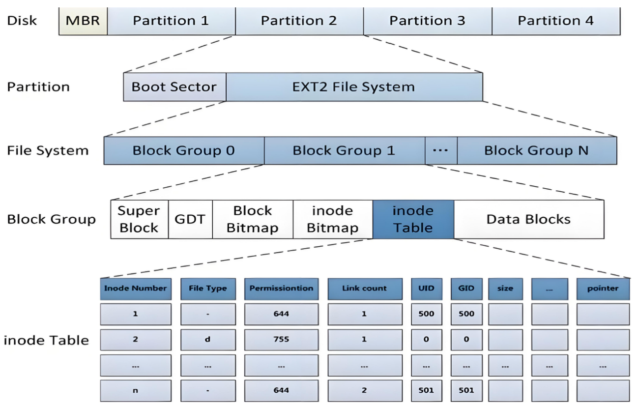 Block Group: 为了提高效率和可靠性,EXT2 文件系统将整个分区进一步划分为多个更小的、结构相同的块组。每个块组都像一个“微型的文件系统”,拥有自己的一套元数据和数据块。这样可以将 inode 表和数据块分散靠近,减少磁头寻道时间。