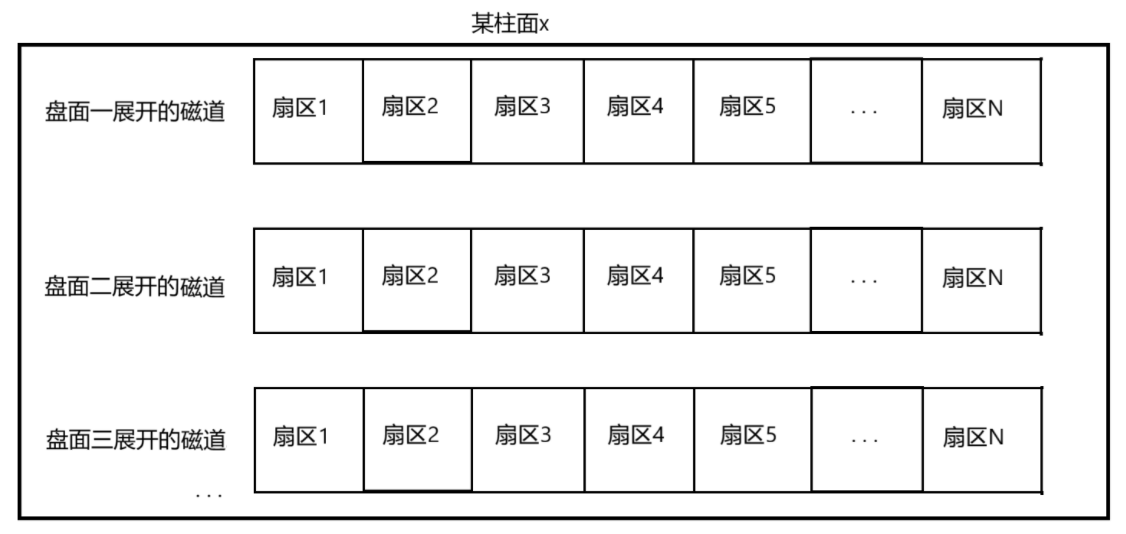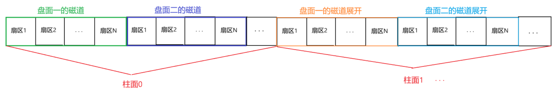 因为前面我们已经提到了:磁头是共进退的,在存储数据时,前一个磁头所指向的磁道数据写完了之后不是往同一个盘面的下一个磁道写,而是往下一个盘面的同一柱面的磁道写数据,所以我们展开时也应该以柱面为单位: