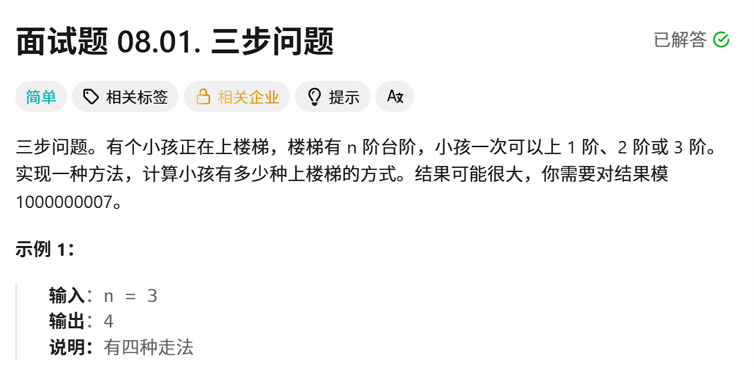 int waysToStep(int n) {const int mod = 1e9 + 7; // 模数if(n == 1 || n == 2)return n;if(n == 3)return 4;vector<int> dp(n+1);dp[1] = 1; dp[2] = 2; dp[3] = 4;for(int i = 4; i <= n; i++){dp[i] = ((dp[i-1] + dp[i-2])%mod + dp[i-3])%mod;}return dp[n];