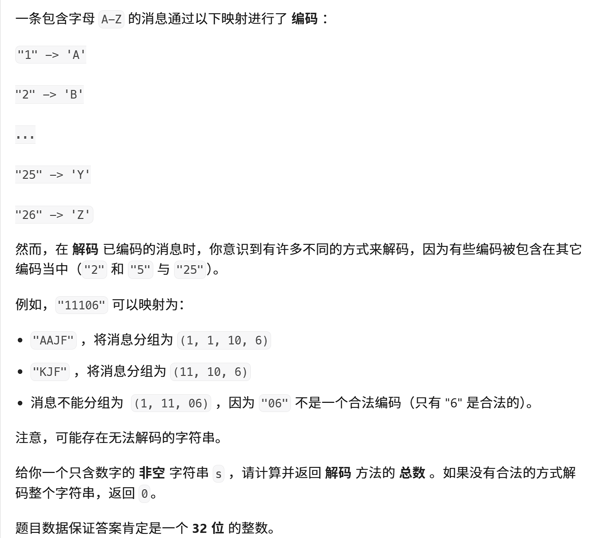 int numDecodings(string s) {int n = s.size();vector<int> dp(n+1, 0);dp[0] = 1;dp[1] = s[0] != '0';if(n == 1) return dp[1];for(int i = 2; i <= n; i++){// dp[i]单独解码if(s[i-1] != '0'){dp[i] += dp[i-1];}// dp[i]和dp[i-1]一起解码int val = (s[i-2] - '0')*10 + s[i-1]-'0';if(val >= 10 && val <= 26){dp[i] += dp[i-2];}}return dp[n];}