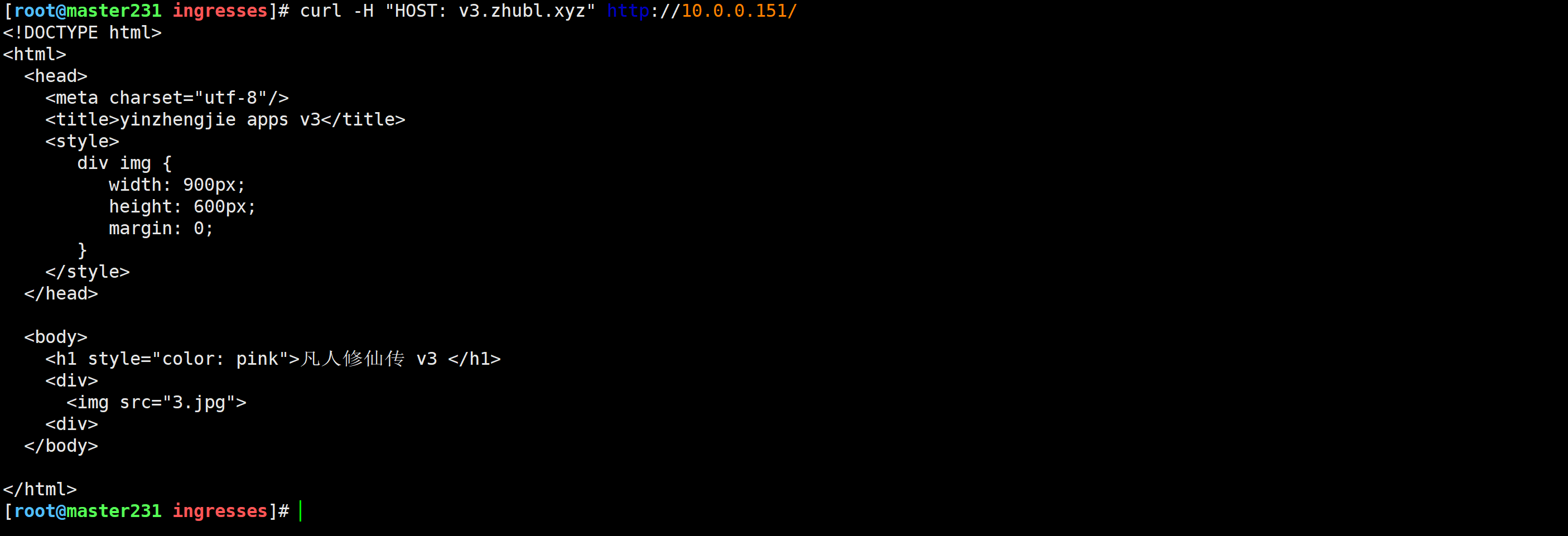 [root@master231 ingresses]# curl -H "HOST: v3.zhubl.xyz" http://10.0.0.151/