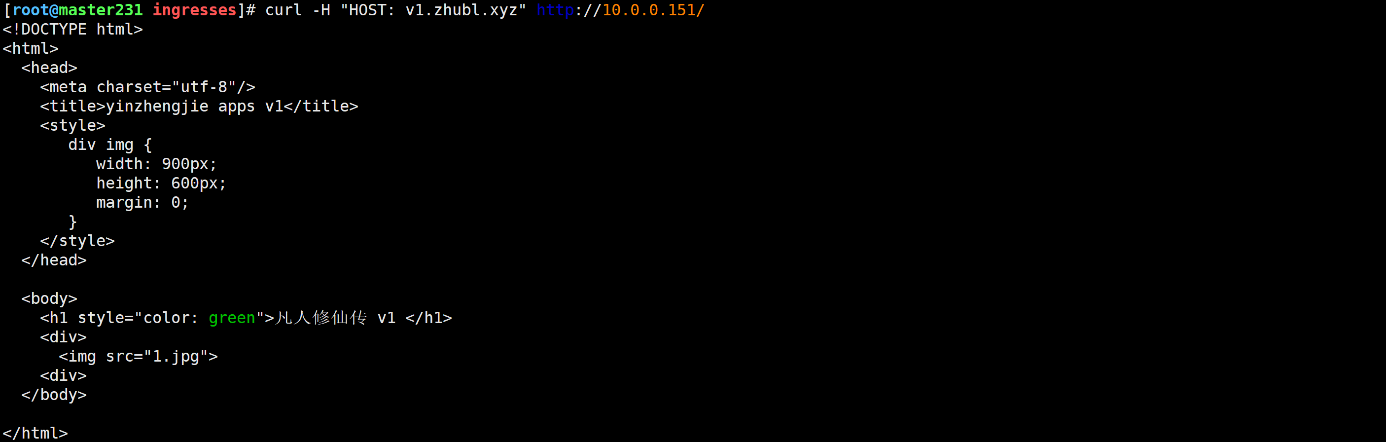 [root@master231 ingresses]# curl -H "HOST: v1.zhubl.xyz" http://10.0.0.151/