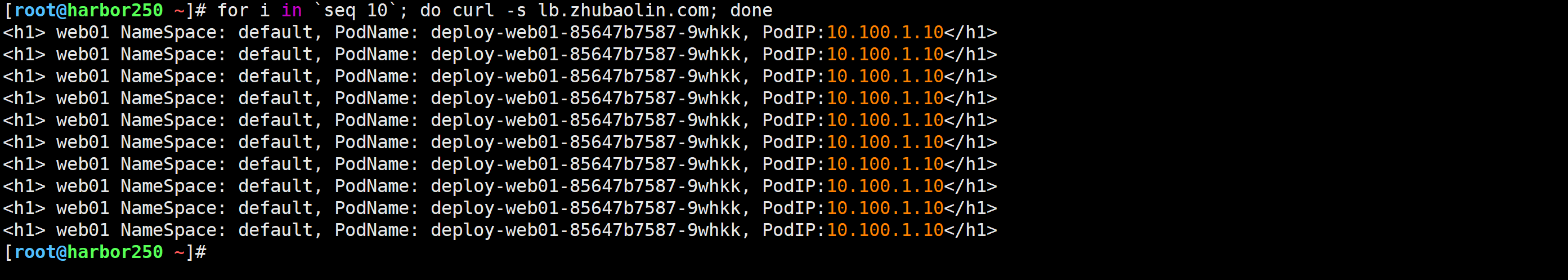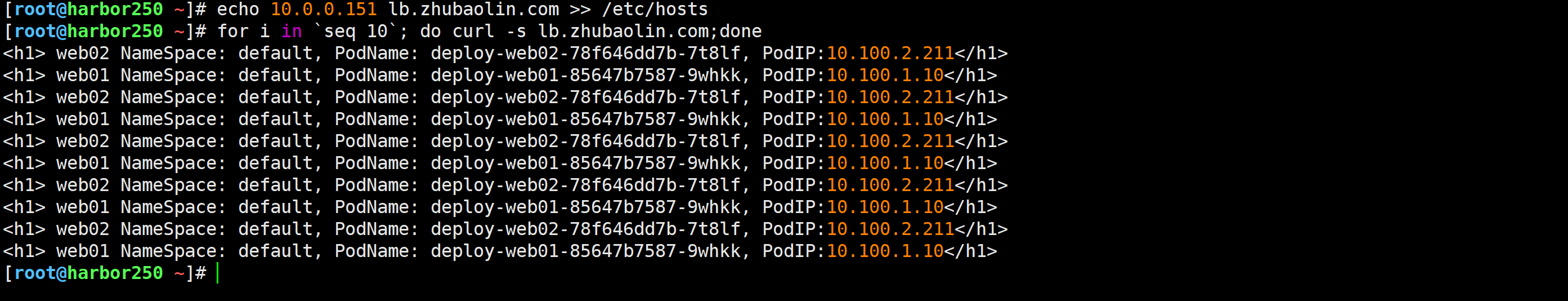 [root@harbor250 ~]# for i in `seq 10`; do curl -s lb.zhubaolin.com; done