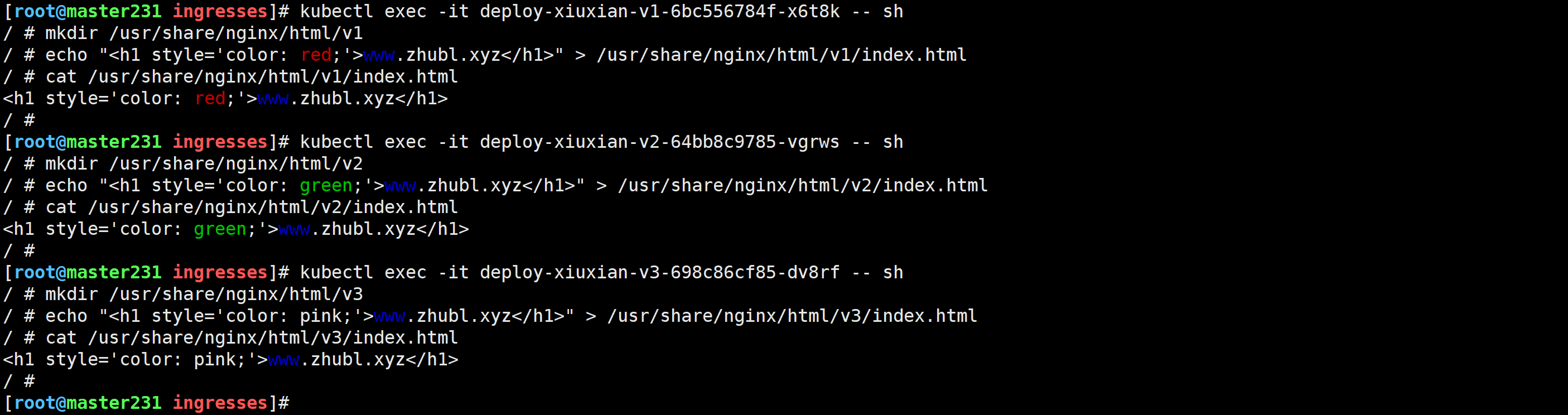 cat /usr/share/nginx/html/v2/index.html[root@master231 ingresses]# kubectl exec -it deploy-xiuxian-v3-698c86cf85-dv8rf -- sh
