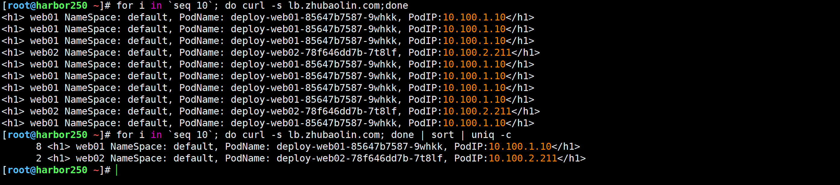 [root@harbor250 ~]# for i in `seq 10`; do curl -s lb.zhubaolin.com; done | sort | uniq -c