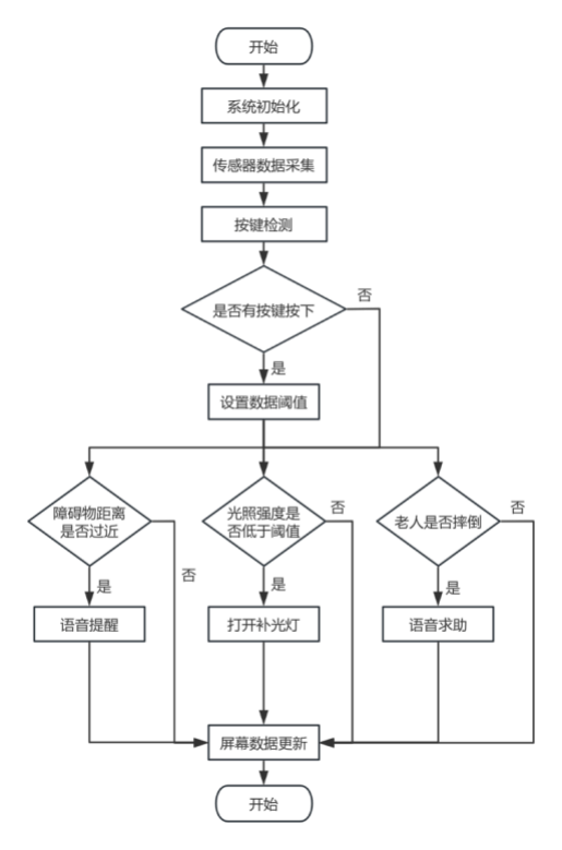 {HC_SR04_Deboanle(&distance); //获取前方障碍物距离Get_Light_Value(&Light_Value); //获取环境光照强度Get_Water_Value(&Water_Value); //获取前方积水FallDetection(); //摔倒检测