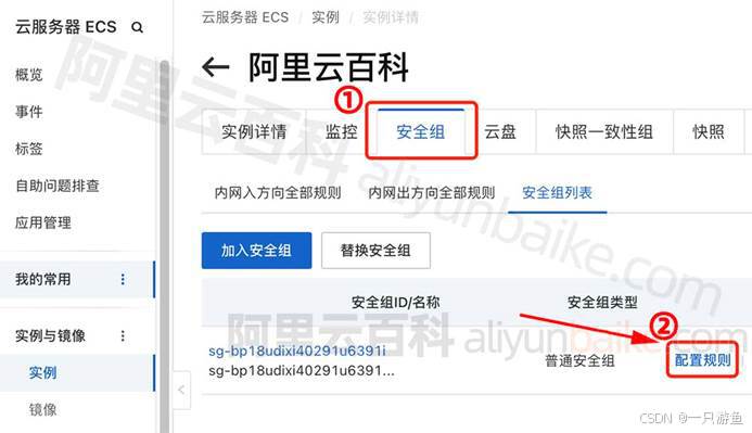 3、切换到【安全组】页面,点击右侧【配置规则】,如下图: