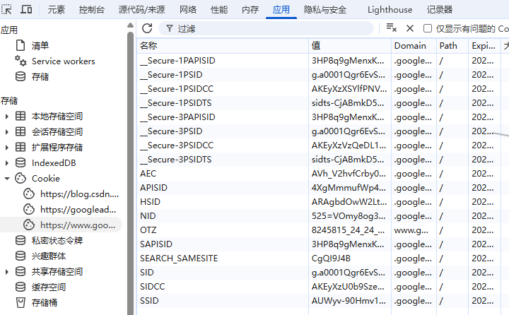 在浏览器中,我们点击F12可以直接查看到Cookie的存储信息:
