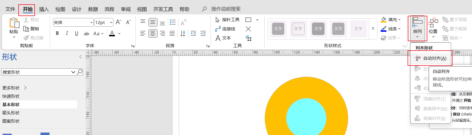 2.拖拽两个圆形,通过开始->排列->对齐的方式实现对齐