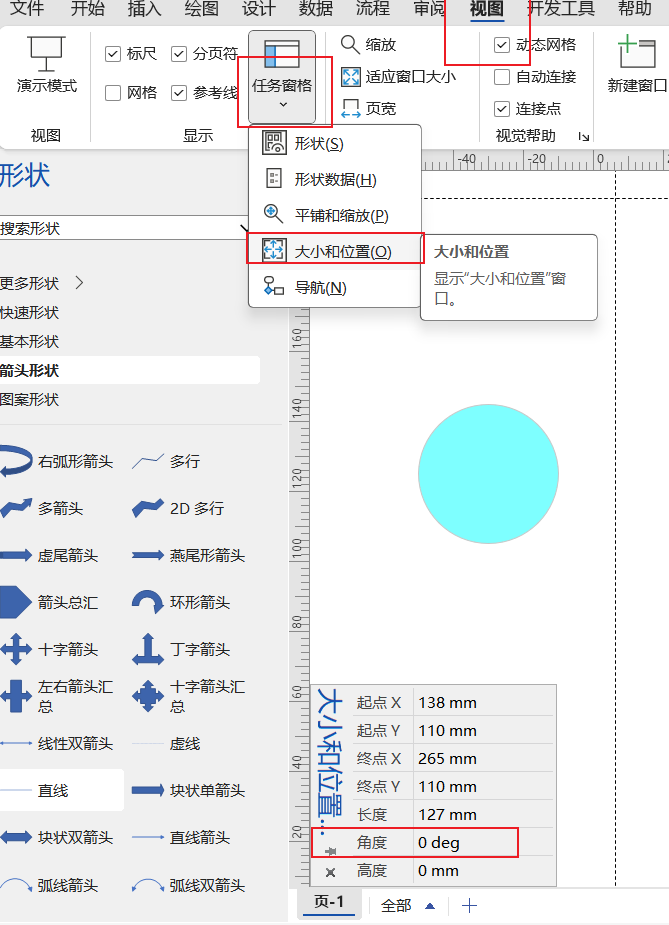 4.选择一条直线以圆环原点为圆心,通过视图->显示任务窗格->大小和位置找到角度进行设置
