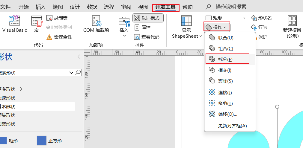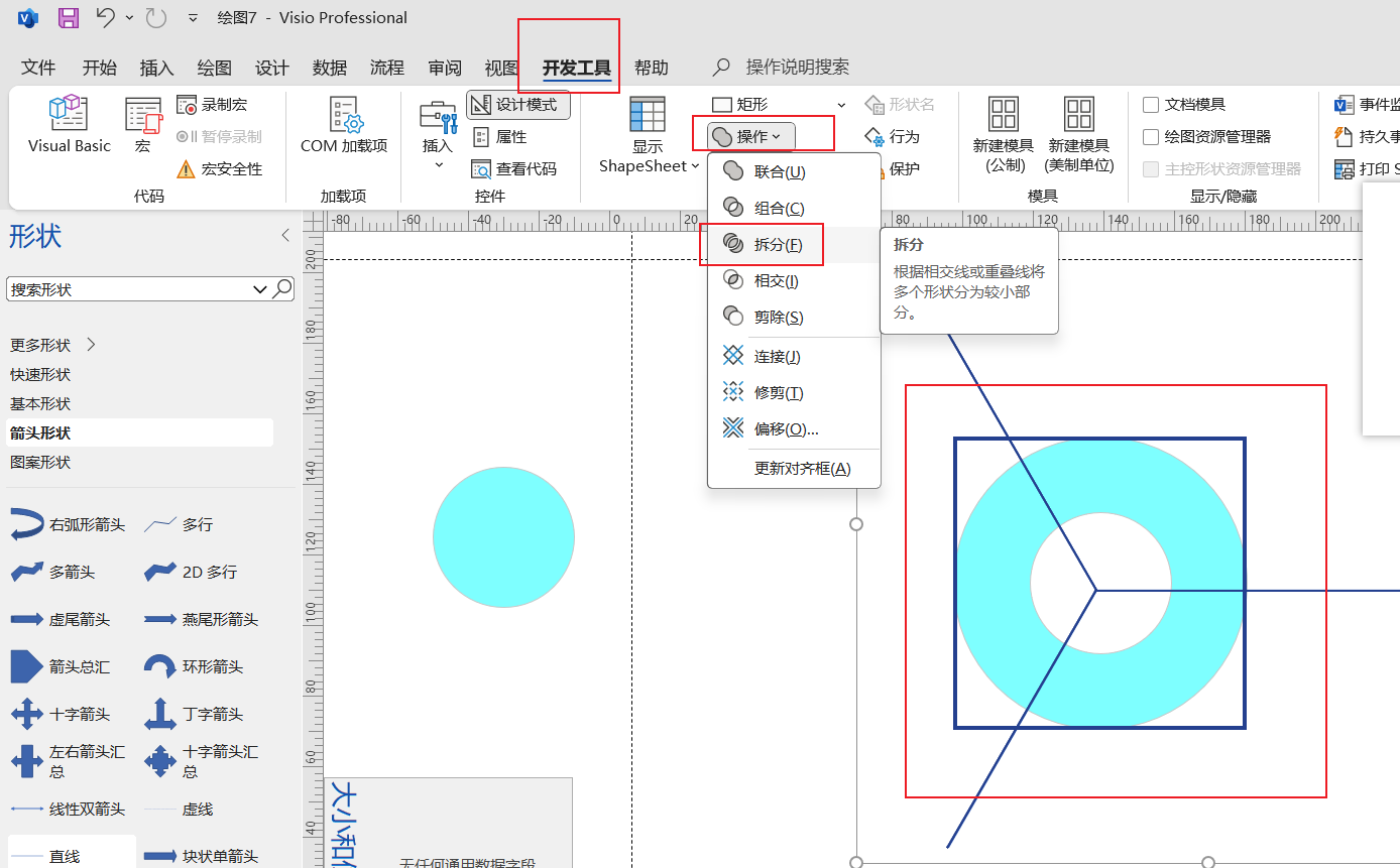 5.选中所有直线及圆环,开发工具->操作->拆分获得三等分扇形