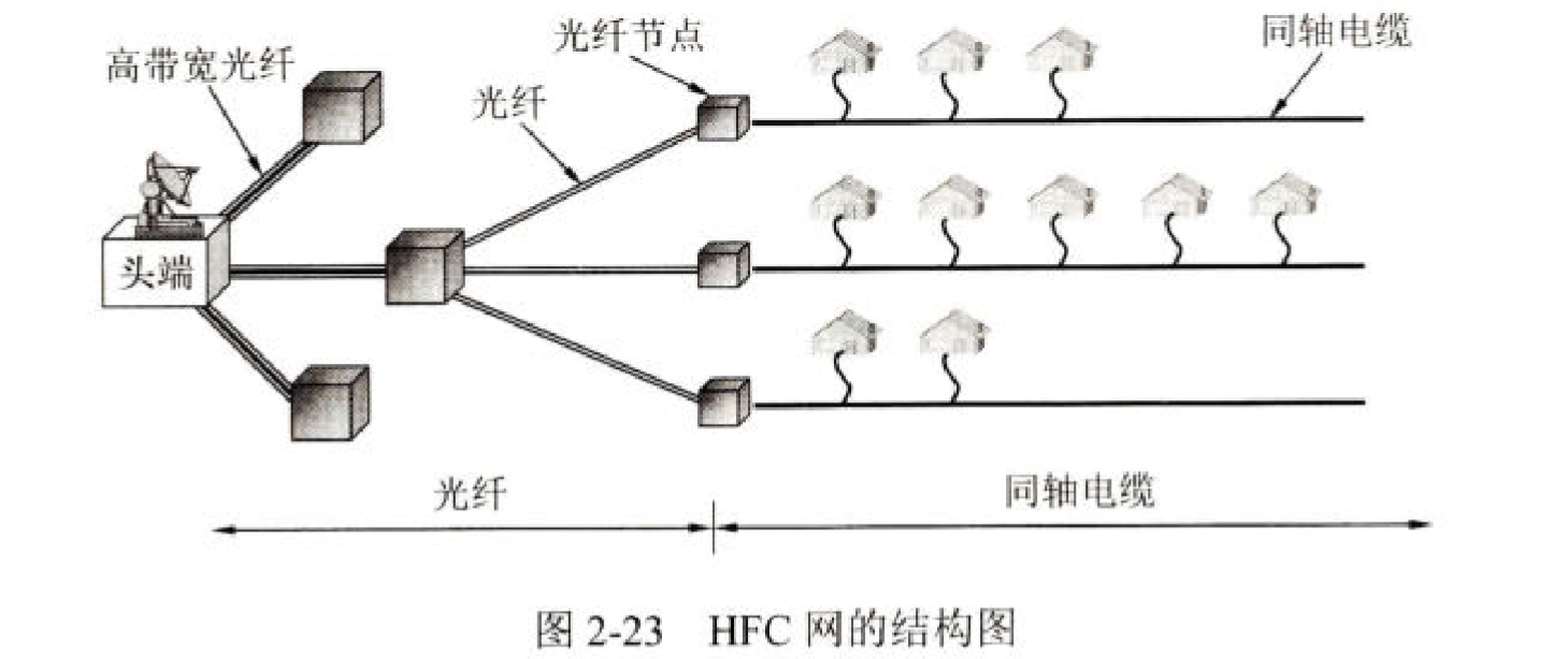 早期有线电视网:完全靠同轴电缆(树形拓扑),频分复用模拟传输 → 只能单向广播电视