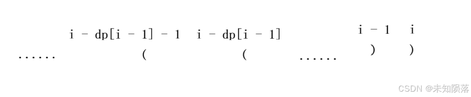 - i - 1的位置为),如果dp[i - 1] >= 0的话,表示前面还有有效括号,并且i - dp[i - 1] - 1 >= 0,i - dp[i - 1] - 1的位置为(,dp[i] = dp[i - 1] + 2,如果i - dp[i - 1] - 2 >= 0的话,dp[i] = dp[i - 1] + 2 + dp[i - dp[i - 1] - 2],下面用图表示