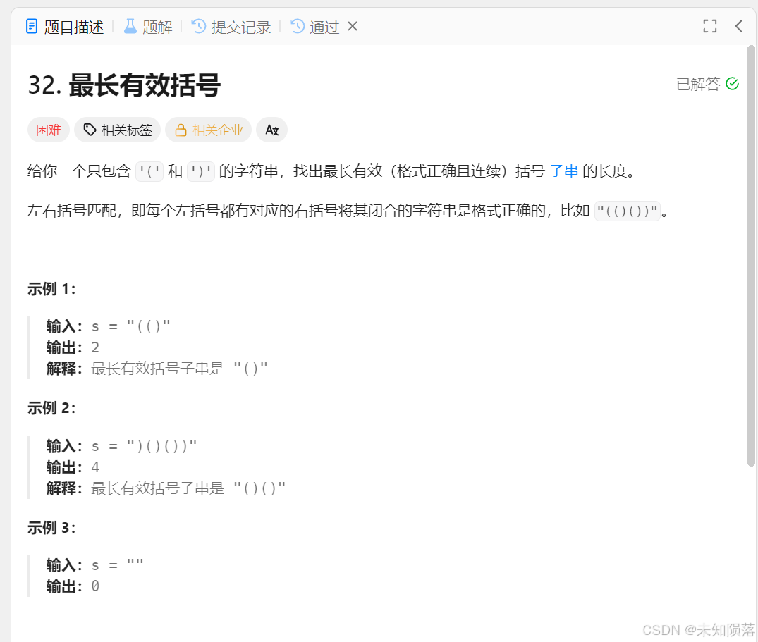 public:int longestValidParentheses(string s) {int n = s.size();vector<int> dp(n);int length = 0;for(int i = 1; i < n; i++){if(s[i] == ')'){if(s[i - 1] == '('){dp[i] = 2;if(i - 2 >= 0)dp[i] = dp[i - 2] + dp[i];}else{if(dp[i - 1] >= 0){if(i - dp[i - 1] - 1 >= 0 && s[i - dp[i - 1] - 1] == '('){dp[i] = dp[i - 1] + 2;if(i - dp[i - 1] - 2 >= 0)dp[i] = dp[i] + dp[i - dp[i - 1] - 2];}}}}length = max(length, dp[i]);}return length;}