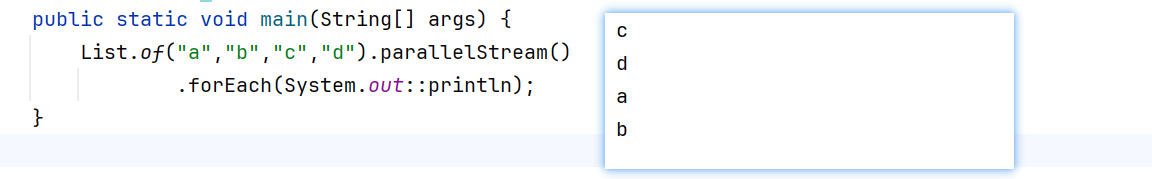 List.of("a","b","c","d").parallelStream().forEach(System.out::println);