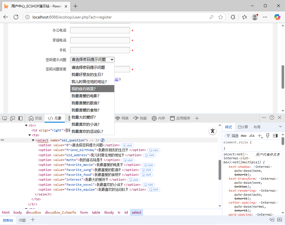 11、 因为要操作下拉选择框,所以先定位到这个下拉框,以‘密码提示问题’下拉选择框为例;