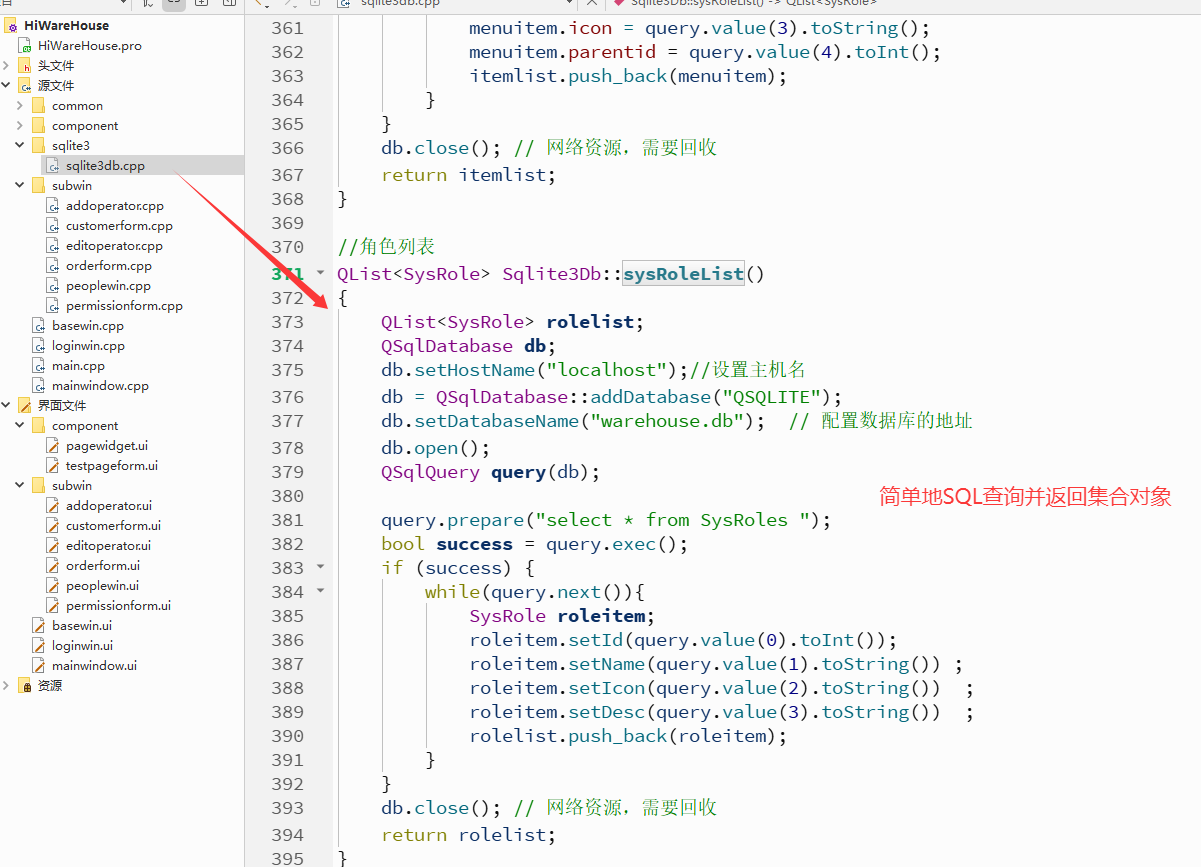 {QList<SysRole> rolelist;QSqlDatabase db;db.setHostName("localhost");//设置主机名db = QSqlDatabase::addDatabase("QSQLITE");db.setDatabaseName("warehouse.db"); // 配置数据库的地址db.open();QSqlQuery query(db);query.prepare("select * from SysRoles ");bool success = query.exec();if (success) {while(query.next()){SysRole roleitem;roleitem.setId(query.value(0).toInt());roleitem.setName(query.value(1).toString()) ;roleitem.setIcon(query.value(2).toString()) ;roleitem.setDesc(query.value(3).toString()) ;rolelist.push_back(roleitem);}}db.close(); // 网络资源,需要回收return rolelist;