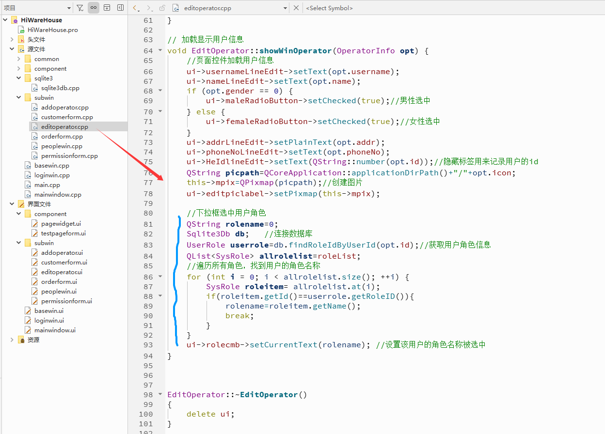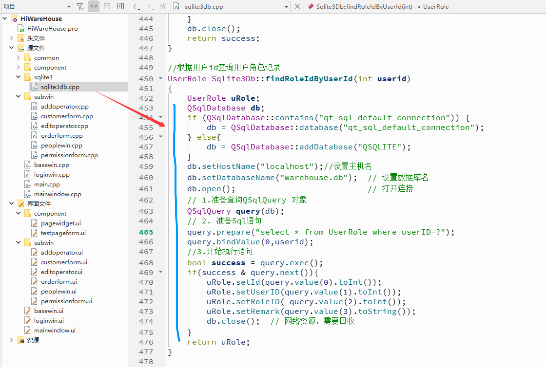 {UserRole uRole;QSqlDatabase db;if (QSqlDatabase::contains("qt_sql_default_connection")) {db = QSqlDatabase::database("qt_sql_default_connection");} else{db = QSqlDatabase::addDatabase("QSQLITE");}db.setHostName("localhost");//设置主机名db.setDatabaseName("warehouse.db"); // 设置数据库名db.open(); // 打开连接// 1.准备查询QSqlQuery 对象QSqlQuery query(db);// 2. 准备Sql语句query.prepare("select * from UserRole where userID=?");query.bindValue(0,userid);//3.开始执行语句bool success = query.exec();if(success & query.next()){uRole.setId(query.value(0).toInt());uRole.setUserID(query.value(1).toInt());uRole.setRoleID( query.value(2).toInt());uRole.setRemark(query.value(3).toString());db.close(); // 网络资源,需要回收}return uRole;