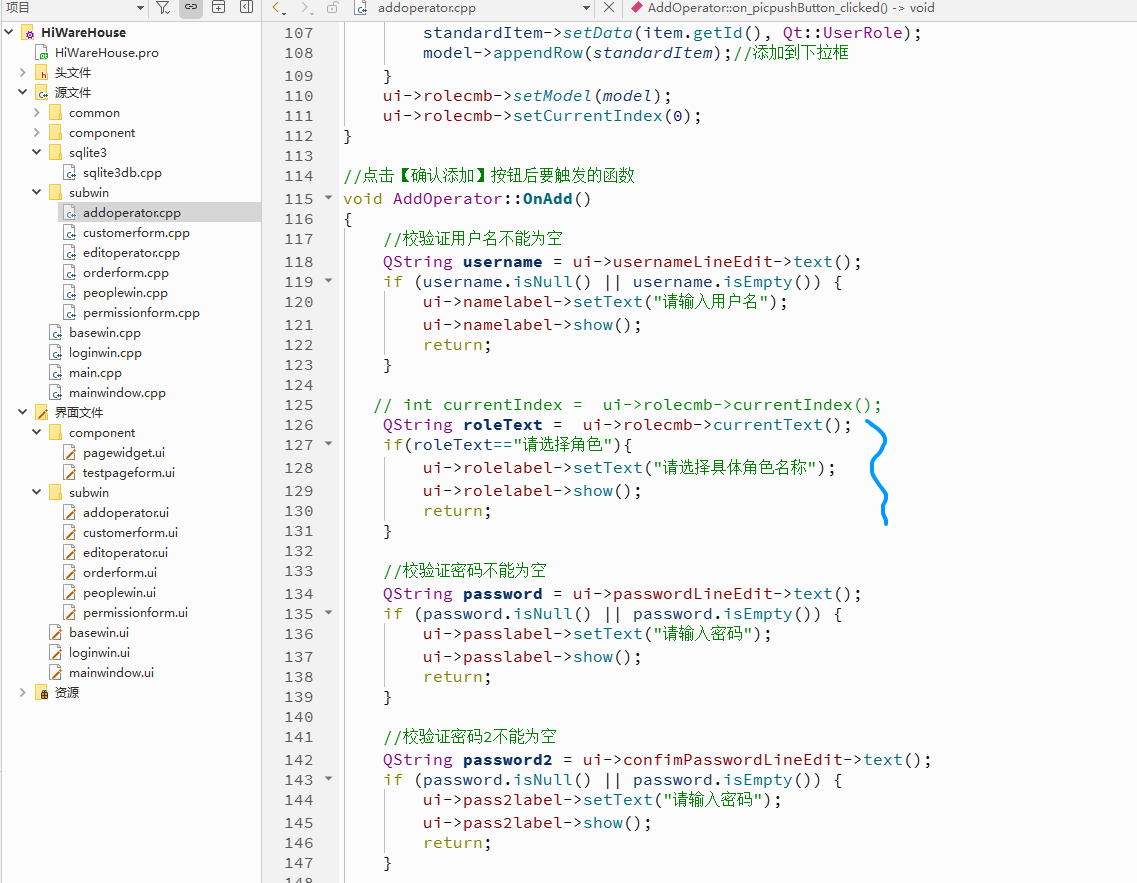 {ui->setupUi(this);ui->maleRadioButton->setChecked(true);//默认让男性勾中//创建外围窗口if(m_basewin==nullptr){m_basewin=new BaseWin(parent);}m_basewin->setContentWidget(this);//将当前内容区域窗体嵌套到外围窗口m_basewin->setTitle("新增人员");m_basewin->resize(650, 530);m_basewin->show();//显示//获取指定按钮并绑定事件QPushButton *b1=m_basewin->getButton();if(b1){b1->setText("确认添加");//给按钮绑定点击事件的槽函数QObject::connect(b1,&QPushButton::clicked,this,&AddOperator::OnAdd);}//获取指定按钮并绑定事件QPushButton *b2=m_basewin->getButton2();if(b2){b2->setText("取消关闭");//给按钮绑定点击事件的匿名的槽函数QObject::connect(b2,&QPushButton::clicked,[=]{m_basewin->close();});}// 清空输入框的提示信息========================================ui->usernameLineEdit->setPlaceholderText("请输入用户名");ui->passwordLineEdit->setPlaceholderText("请输入密码");ui->passwordLineEdit->setEchoMode(QLineEdit::Password);ui->confimPasswordLineEdit->setPlaceholderText("再次输入密码");ui->confimPasswordLineEdit->setEchoMode(QLineEdit::Password);ui->nameLineEdit->setPlaceholderText("请输入用户名");ui->phoneNoLineEdit->setPlaceholderText("请输入手机号码");ui->addrLineEdit->setPlaceholderText("请输入地址~~");// 初始化输入框的提示信息========================================ui->usernameLineEdit->setText("");ui->passwordLineEdit->setText("");ui->passwordLineEdit->setText("");ui->confimPasswordLineEdit->setText("");ui->nameLineEdit->setText("");ui->phoneNoLineEdit->setText("");ui->addrLineEdit->setPlainText("");// 通过正则表达式去验证,如果手机号中的文本框,内容发生改变,就校验规则Ui::AddOperator *uiNew = ui;//创建界面设计的UI对象QRegularExpression regExt("^1[3456789]\\d{9}$");// 定义一个验证规则QRegularExpressionValidator *validator = new QRegularExpressionValidator(regExt, ui->phoneNoLineEdit); // 创建一个正则表达式,用于验证数据此处验证手机号//手机号码输入框绑定信号textChanged(文字内容发生改变时)和槽函数(匿名函数来处理)QObject::connect(ui->phoneNoLineEdit, &QLineEdit::textChanged, [uiNew, validator]() {// 控件中的内容发生改变,就触发信号,执行到这里处理int pos = 0;QString inputNo = uiNew->phoneNoLineEdit->text();if (validator->validate(inputNo, pos) != QValidator::Acceptable) {//如何校验不通过uiNew->phoneNoLineEdit->setStyleSheet("QLineEdit { border: 1px solid red; }");//设置手机框的边框样式uiNew->mobilMsg->setText("请输入符合格式的手机号~");//设置提示内容uiNew->mobilMsg->setStyleSheet("QLabel { color: red; }");//设置文字为红色} else {//校验通过时uiNew->mobilMsg->setStyleSheet("");uiNew->mobilMsg->setText("");}});initRoleList();