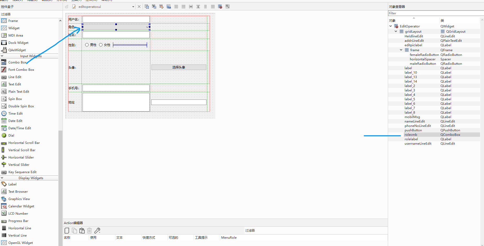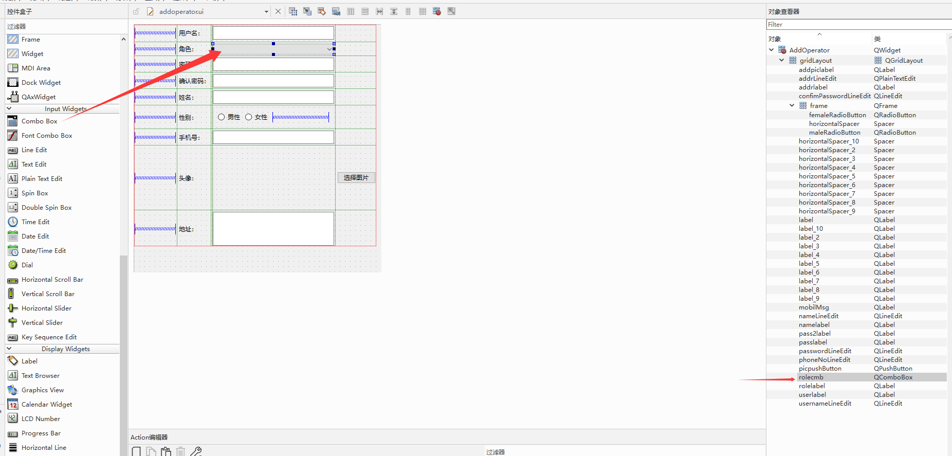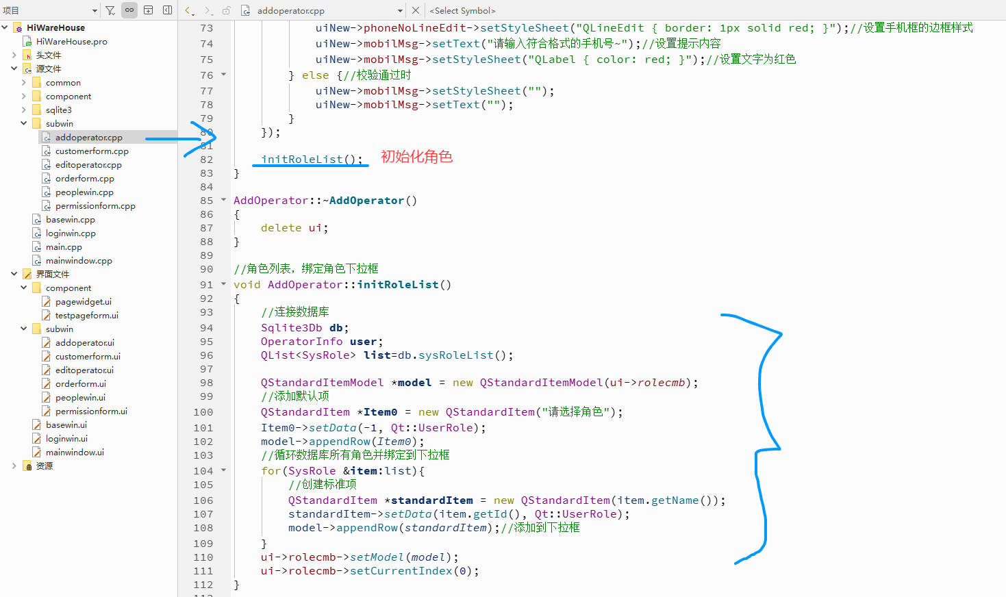 {//连接数据库Sqlite3Db db;OperatorInfo user;QList<SysRole> list=db.sysRoleList();QStandardItemModel *model = new QStandardItemModel(ui->rolecmb);//添加默认项QStandardItem *Item0 = new QStandardItem("请选择角色");Item0->setData(-1, Qt::UserRole);model->appendRow(Item0);//循环数据库所有角色并绑定到下拉框for(SysRole &item:list){//创建标准项QStandardItem *standardItem = new QStandardItem(item.getName());standardItem->setData(item.getId(), Qt::UserRole);model->appendRow(standardItem);//添加到下拉框}ui->rolecmb->setModel(model);ui->rolecmb->setCurrentIndex(0);