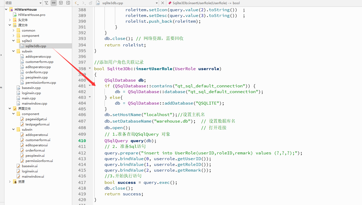 {QSqlDatabase db;if (QSqlDatabase::contains("qt_sql_default_connection")) {db = QSqlDatabase::database("qt_sql_default_connection");} else{db = QSqlDatabase::addDatabase("QSQLITE");}db.setHostName("localhost");//设置主机名db.setDatabaseName("warehouse.db"); // 设置数据库名db.open(); // 打开连接// 1.准备查询QSqlQuery 对象QSqlQuery query(db);// 2. 准备Sql语句query.prepare("insert into UserRole(userID,roleID,remark) values (?,?,?);");query.bindValue(0, userrole.getUserID());query.bindValue(1, userrole.getRoleID());query.bindValue(2, userrole.getRemark());//3.开始执行语句bool success = query.exec();db.close();return success;