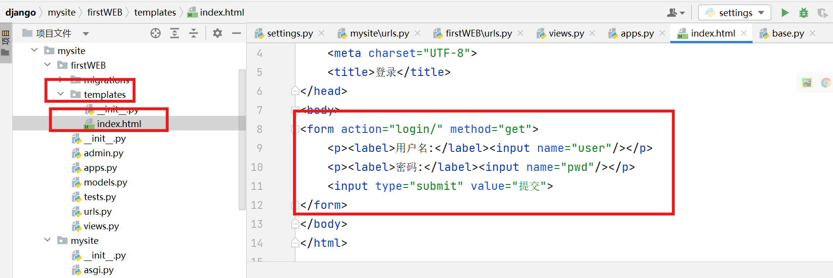 在templates目录下面创建一个html,这里是使用get,但是这样就会使得我们填写的信息暴露 ,一般采用post。但是使用post的话,需要在method="post"第二行加上{% csrf_token %}解决的是安全性的问题。